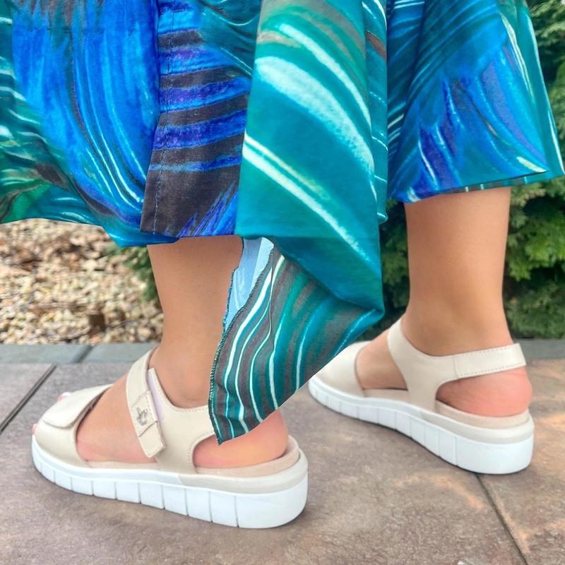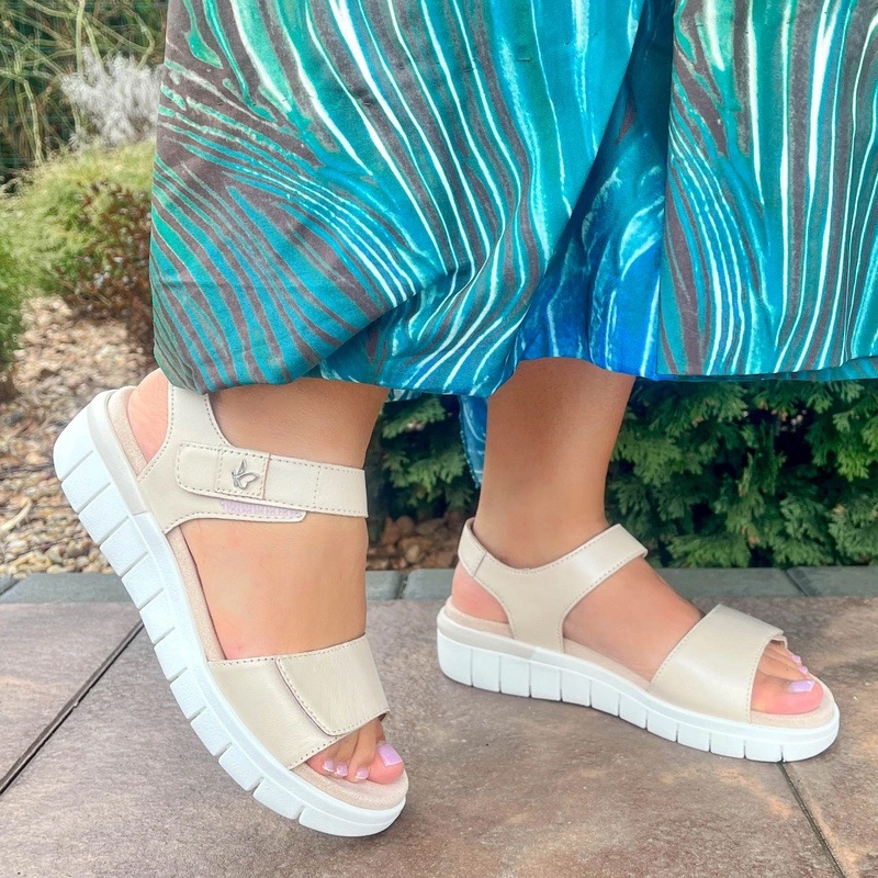 Широкие мягкие ремешки деликатно фиксируют стопу и регулируются с помощью застёжек-липучек. Высота подошвы в пяточной части — 4,5 см. Цвет: кремовый с лёгким перламутровым оттенком. Верх выполнен из натуральной кожи, что дарит ногам ощущение комфорта и свежести. Стелька — из мягкого текстиля, который отлично пропускает воздух. Подкладка сделана из современного качественного износостойкого синтетического материала.